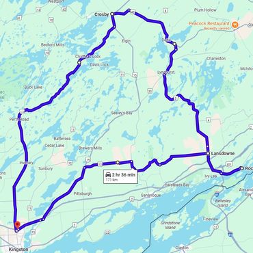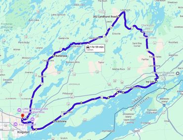 Our 1000 Island cruses will run on Tuesday and Thursday and each day there will be 4 runs of 10 cars (to keep the run size manageable). These runs converge all at once at the boat dock. That's 40 cars and a little under 80 people meeting to take the cruise and have lunch (all included in the cost). Each day there will be two routes. On route A (this one) 10 cars (A-1) will leave going clockwise around the route and 10 cars (A-2) will leave going counterclockwise.